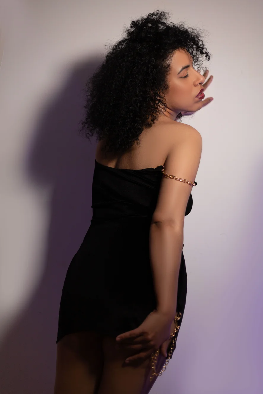 A woman with a serene presence and an intense gaze, whose natural beauty conveys confidence and calm. Her attitude reflects quiet self-assurance, while her style and expression add a subtly sensual and sophisticated touch.